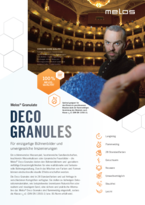 Deco Granules sind in 24 Farben und unterschiedlichen Korngrößen erhältlich. Die vielfältigen Einsatzmöglichkeiten der Granulate bieten Bühnenbildnern- und Gestaltern zahlreiche Möglichkeiten, realitätsnahe und fantasievolle Theaterwelten und Bühnenbilder zu erschaffen. Durch das Mischen von Farben und Formen können eindrucksvolle visuelle Effekte erschaffen werden: z.B. ein schimmerndes Wasserspiel, facettenreiche Sandlandschaften, leuchtende Wiesenkulissen oder dynamische Feuerbilder. Melos Kunststoff-Granulate stellen zu bisherigen Theaterbühnen-Dekorationen, wie beispielsweise leicht brennbarem Kork oder rauhem und staubigen Sand, eine sichere und praktische Alternative dar. Selbstverständlich sind Melos Deco Granules flammwidrig eingestellt, so dass die Klasse Bfl-s1 (DIN EN 13501-1) bzw. B1-Norm erfüllt wird.